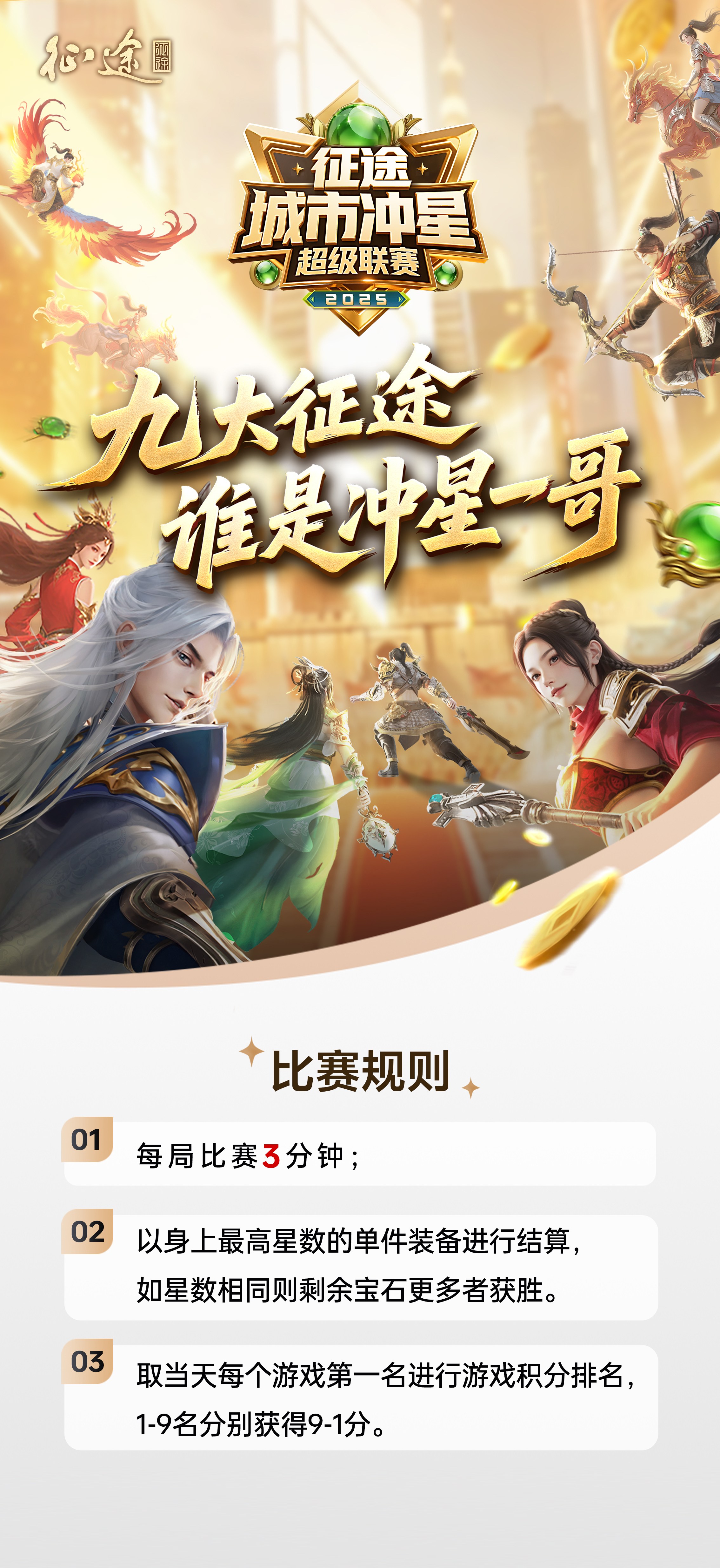 (3)所有城市比赛结束后,总积分最高的游戏将加冕征途“冲星一哥”,该游戏内玩家也将解锁专属奖励!