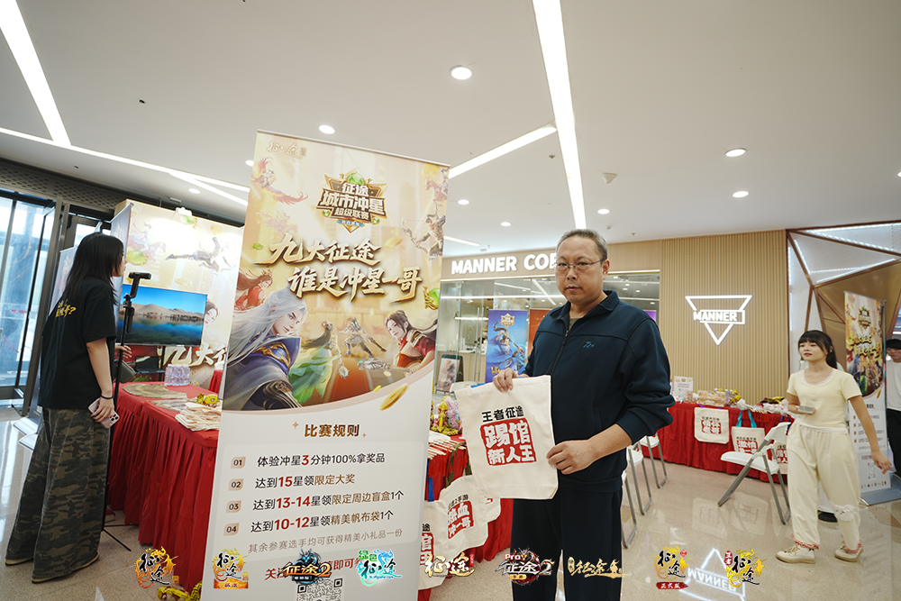 “冲星一哥”蒲扇、“冲超”限定帆布袋等征途周边,成为玩家们争相收藏的热门战利品。许多第一次接触征途的观众也被这股热浪感染,现场上台体验了一把刺激有趣的冲星比赛,真正实现了“破圈共鸣”。
