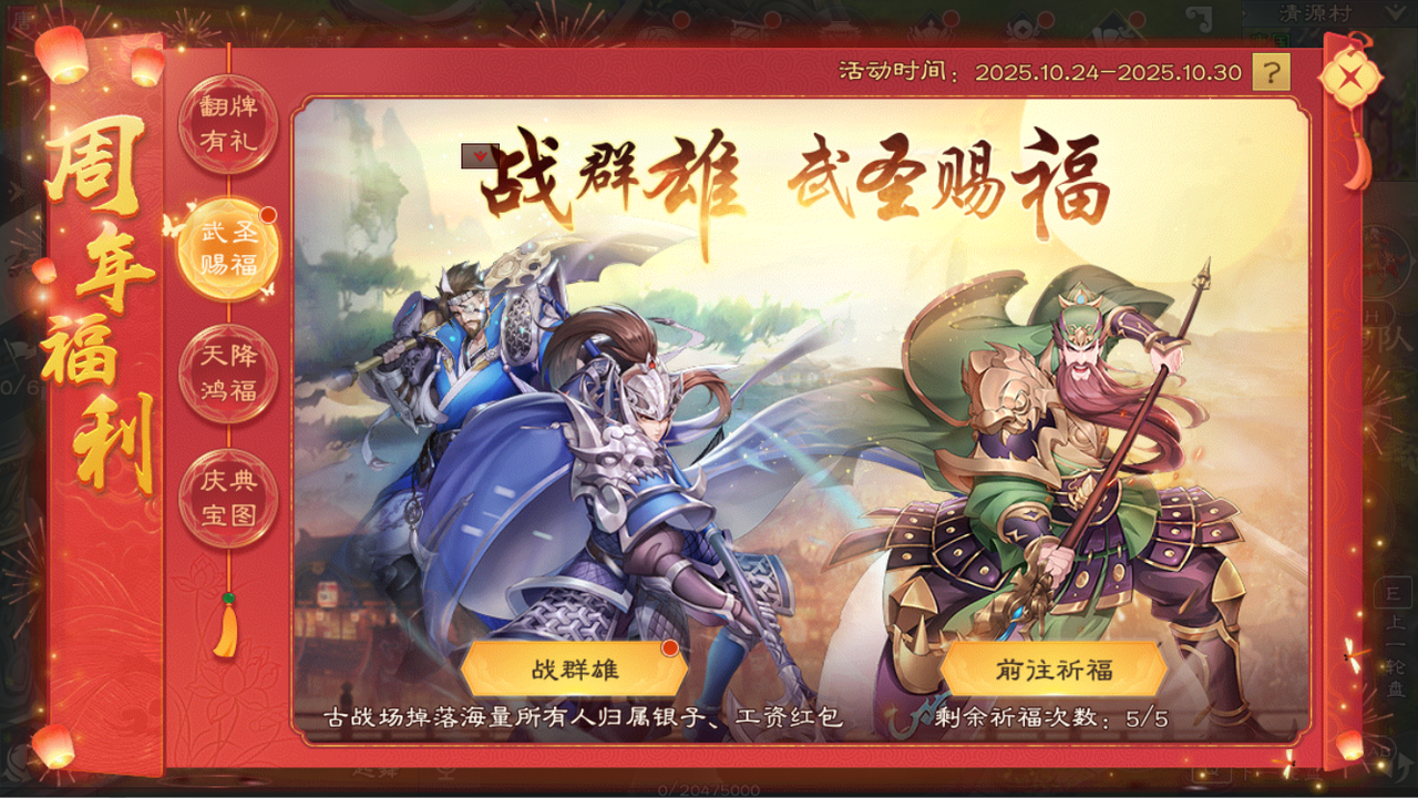 古战场的 BOSS 们携厚礼而来!击败黄 BOSS、绿紫 BOSS 有几率掉落关羽专属道具,上交家族地图的【武圣关羽】可兑换武运值与随机奖励,每日最多 5 次机会。更有惊喜彩蛋:触发善财童子后,家族地图将刷出工资宝箱;击败绿、紫 BOSS 还能解锁全员归属的周年庆银子、工资红包,兄弟同心福利翻倍!