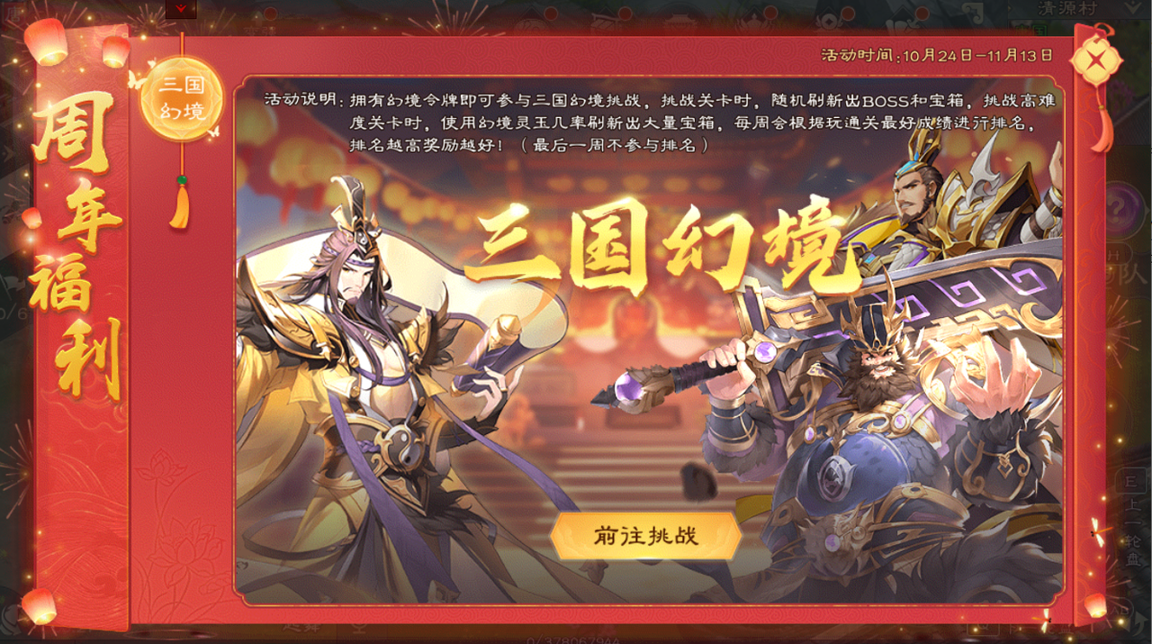 活动期间拥有幻境令牌即可参与三国幻境挑战!普通、困难、传说三大难度任你选,每个难度包含 3 大关、12 小关,关底必定产出宝箱,评价越高宝箱品质越珍稀。关卡中还会随机刷新幻境宝箱,品质决定奖励丰厚度,策略与实力的考验等你来战!