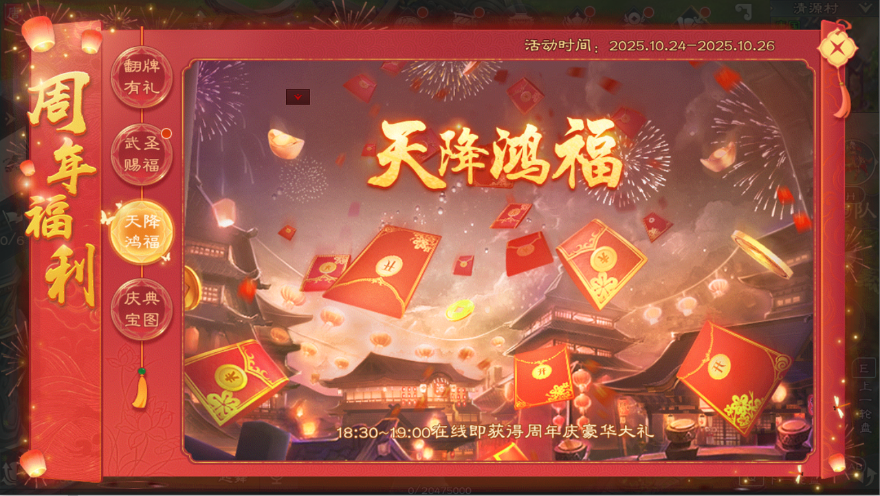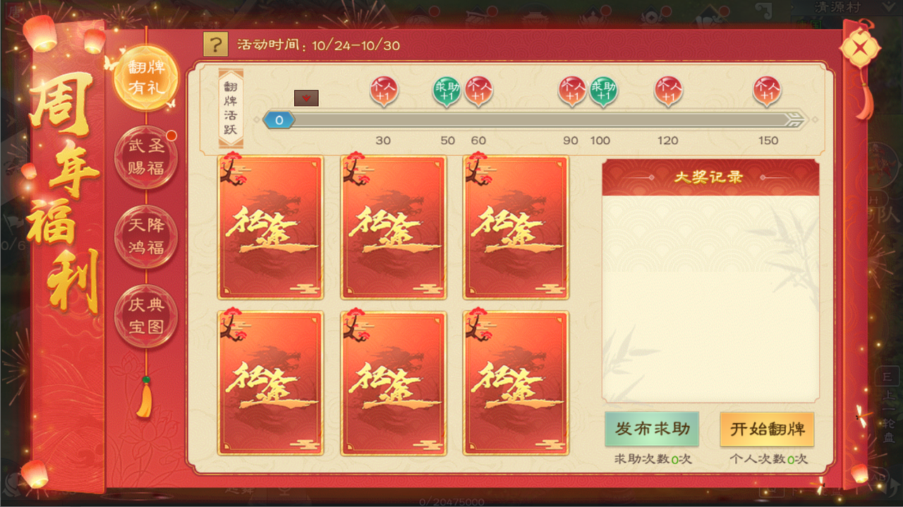 角色达 50 级即可参与!每日最高 7 次翻牌机会,提升活跃度就能解锁个人抽奖与求助抽奖次数。绿色武神卡、紫色将魂、四级天地魔石等超值道具一键获取,轻松实现战力进阶,周年庆开局即巅峰!