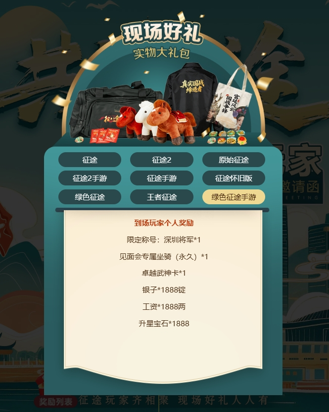 1、精美实物奖励:现场领取征途定制夹克、定制旅行包等周边好礼,精彩记忆带回家!