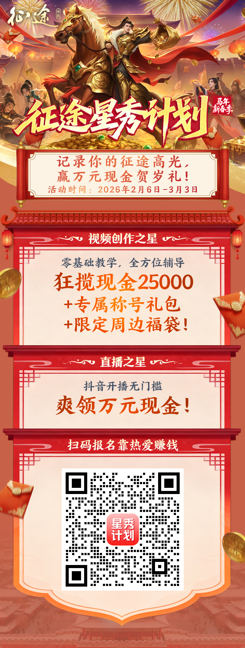 骏马踏春启新程,福泽九州贺新春!辞旧岁,迎新春,征途星秀计划・马年新春季正式启动!2026年2月6日至3月3日期间,征途全网招募直播、短视频创作达人,解锁万元现金大奖、马年专属游戏礼包、精美周边等重磅福利!