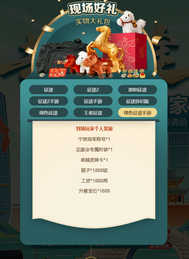 1、臻享实物周边:到场玩家可领取征途旅行包、征途战马挂饰、金马摆件等精美伴手礼,将聚会记忆带回家珍藏。